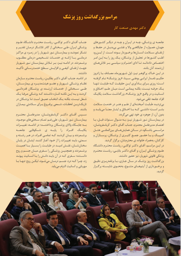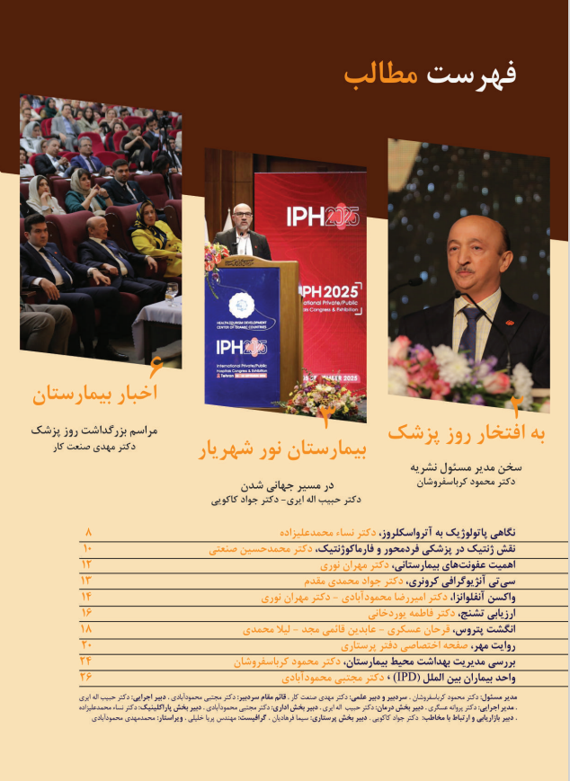 انتشار این شماره از «طبیبان نور» به عنوان مرجعی علمی و تخصصی برای پزشکان و عموم مردم، نمادي از تعهد بیمارستان نور شهریار به ارتقای سطح آگاهیهای پزشکی و بهداشتی جامعه میباشد